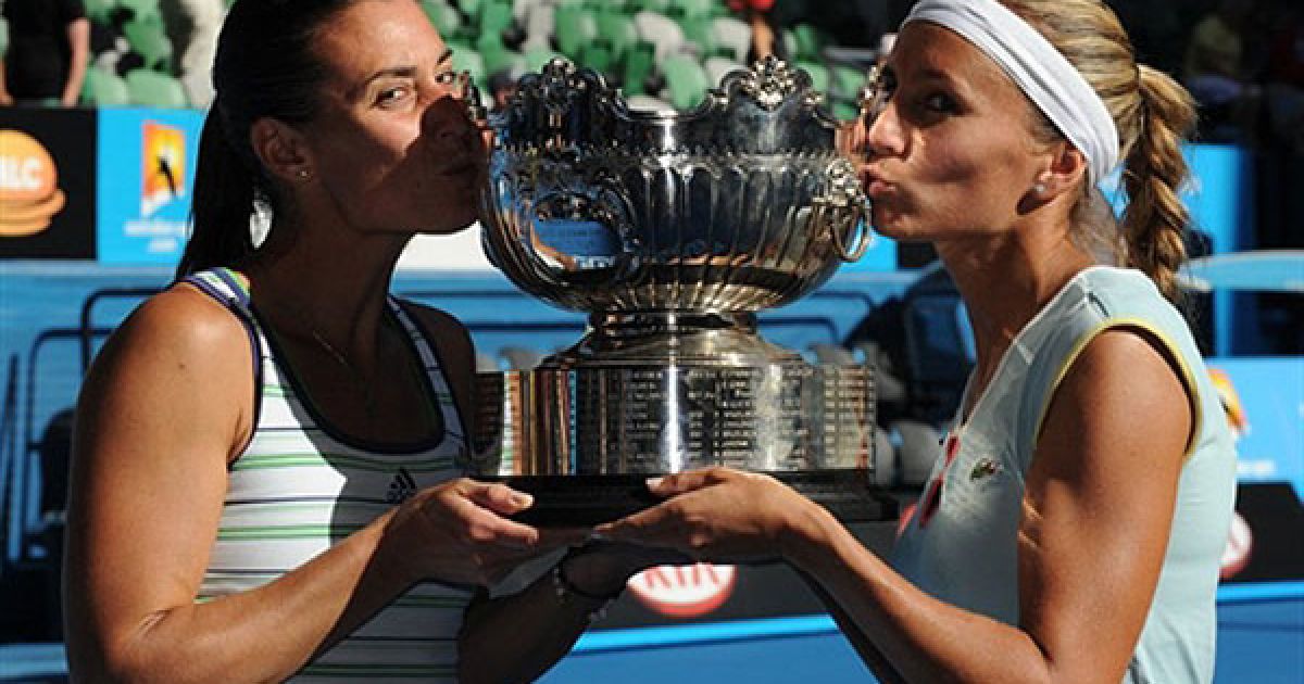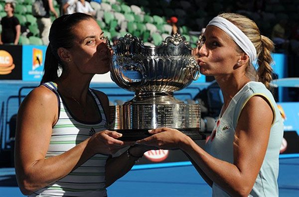 Австралія, Мельбурн. Італійська тенісистка Флавія Пеннетта і аргентинська тенісистка Гізела Дулко цілують трофей після перемоги над росіянкою Марією Кириленко і білорускою Вікторією Азаренко у жіночому парному фіналі на Відкритому турнірі Австралії з тенісу. / © AFP