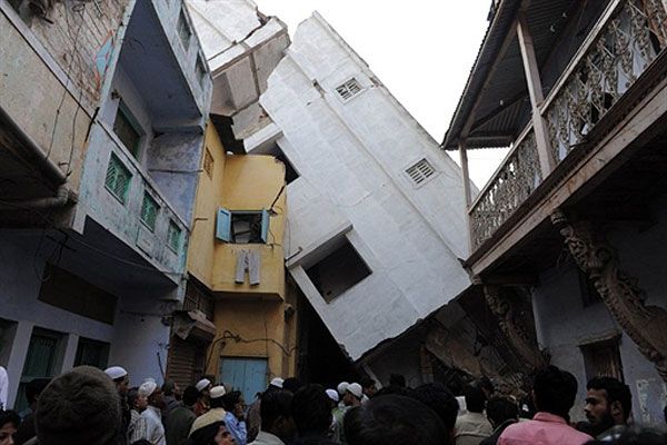 Індія, Ахмедабад. П'ятиповерхова будівля обвалилася на сусідні житлові будинки у місті Ахмедабад. П'ятеро людей загинули, десятки отримали поранення. Рятувальники проводять операцію зі звільнення людей, які залишились під уламками будівлі. / © AFP