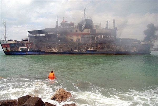 Індонезія, Мерак, Ява. Рятувальники дивляться на пором, який загорівся біля берегів міста Мерак. Принаймні, 11 людей загинули, коли на індонезійському поромі з 400 пасажирами на борту сталася пожежа. / © AFP