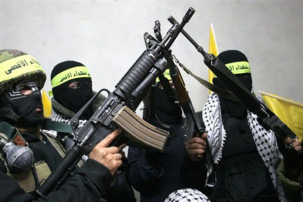 Хеврон. Палестинські бойовики з "Бригади мучеників аль-Акси" під час прес-конференції, на якій вони засудили передбачувані дії палестинських лідерів на мирних переговорах з Ізраїлем. / © AFP