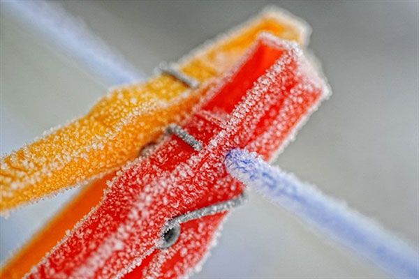 Німеччина, Ганновер. Дві вкриті кригою прищіпки для білизни висять на мотузці у північному німецькому місті Ганновері. / © AFP