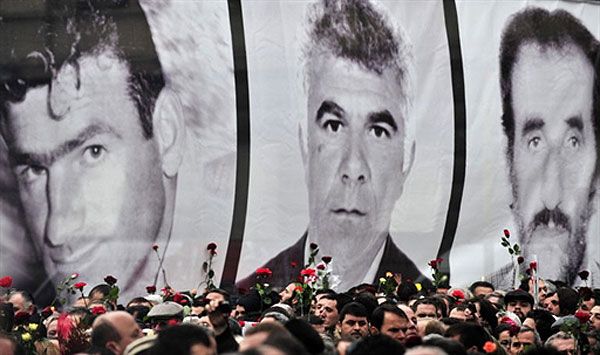 Албанія, Тірана. Протестуючі тримають квіти перед гігантськими портретами жертв смертельних заворушень останніх тижнів. Перед офісом прем'єр-міністра Албанії Салі Беріша провели антиурядову демонстрацію. Албанська опозиція кинула виклик міжнародному співтовариству і готується до інших антиурядових протестів. / © AFP