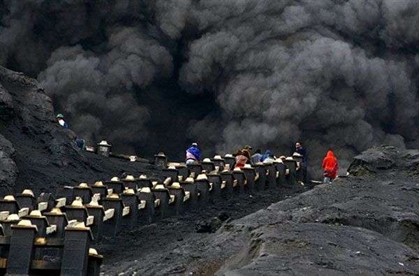 Індонезія, вулкан Бромо. Індонезійські віруючі піднімаються до кратера вулкана Бромо, провінція Східна Ява. Вони принесли підношення богові гори і помолилися за безпеку місцевих жителів. Вулкан продовжує вивергати попіл, через що на Балі скасовують міжнародні авіарейси. / © AFP