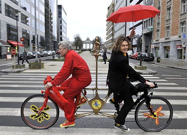 Бельгія, Брюссель. Голландсько-мовний Леон Зоутеб’єр і франкомовний Франц Кокідо сидять на велосипеді, що "їде" у протилежних напрямках, на вулиці Брюсселя. Акція мала привернути увагу до політичної кризи у Бельгії. / © AFP