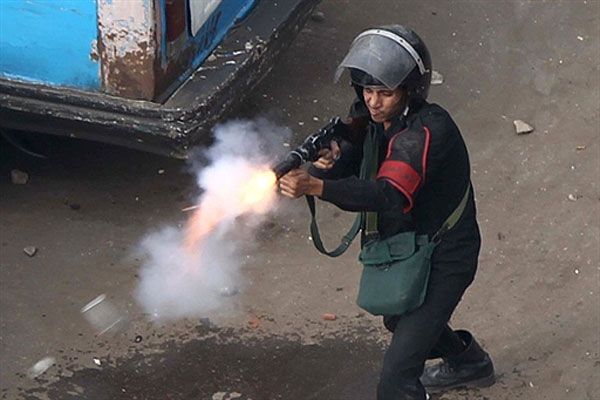 Єгипет, Каїр. Єгипетський поліцейський стріляє сльозогінним газом у демонстрантів під час акції протесту в Каїрі. Демонстранти вимагають повалення президента Хосні Мубарака. / © AFP