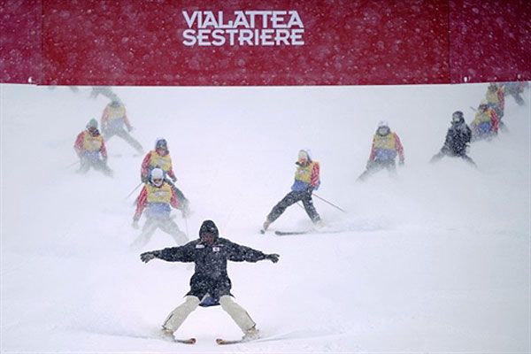 Італія, Сестрієре. Організатори змагань зчищають сніг на горі у Сестрієре. Тренування напередодні проведення Кубку світу зі швидкісного спуску серед жінок був відмінені через погані погодні умови. / © AFP