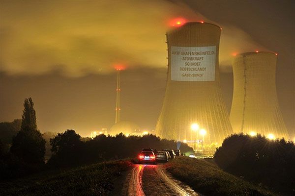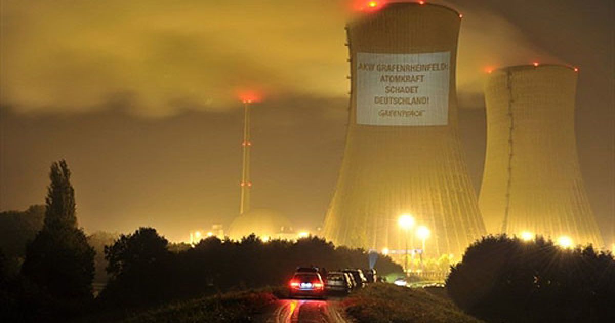Німеччина. Активісти руху "Грінпіс" розтягли гасло "АЕС Grafenrheinfeld: атомна енергетика шкодить Німеччини" на градирні АЕС у південній Німеччині. Активісти "Грінпіс" проводять акції протесту біля всіх дванадцяти німецьких атомних електростанцій. Вони виступають проти рішення німецького кабінету продовжити роботу АЕС у Німеччині на термін від 8 до 14 років. / © AFP