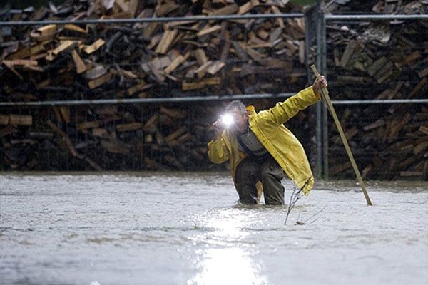 Німеччина. Чоловік робить фотографію затопленої вулиці в місті Wasserkretscham, Східна Німеччина, де вийшла з берегів річка Лоубауер. У багатьох районах Німеччини почались повені через тривалі і сильні дощі. / © AFP