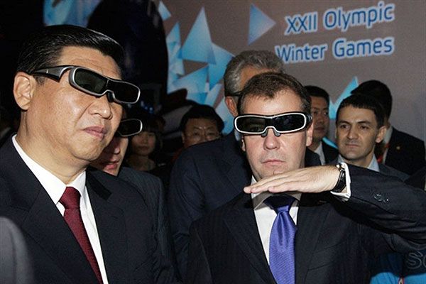 Китай, Шанхай. Президент Росії Дмитро Мєдведєв і віце-президент КНР Сі Цзіньпін у спеціальних окулярах під час відвідування "World Expo 2010" у Шанхаї. Президент РФ завершує державний візит до Китаю. / © AFP