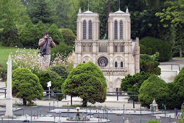 Франція, Еланкур. Турист фотографує мініатюрні копії Собору Паризької Богоматері, єгипетського обеліску на площі Згоди у Парижі під час відвідування парку "Франція у мініатюрі", який відкрили в передмісті Парижа. Парк, який цього року відзначає своє 20-річчя, займає 5 га. / © AFP