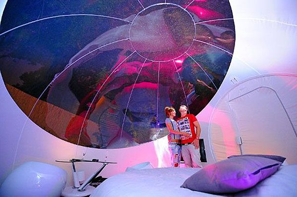 Франція, Рубе. Відвідувачі "номера-бульбашки" в парку міста Рубе у північній Франції. Гігантські "кімнати-бульбашки", виготовлені з переробленого пластика, тиск в яких підтримують спеціальні пристрої, планують здавати як номери в готелі просто неба. / © AFP