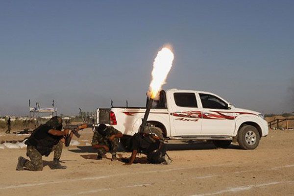 Нусейрат. Палестинські бойовики з руху "Ісламський джихад" запускають снаряд під час в таборі біженців Нусейрат в центральній частині сектора Газа. / © AFP