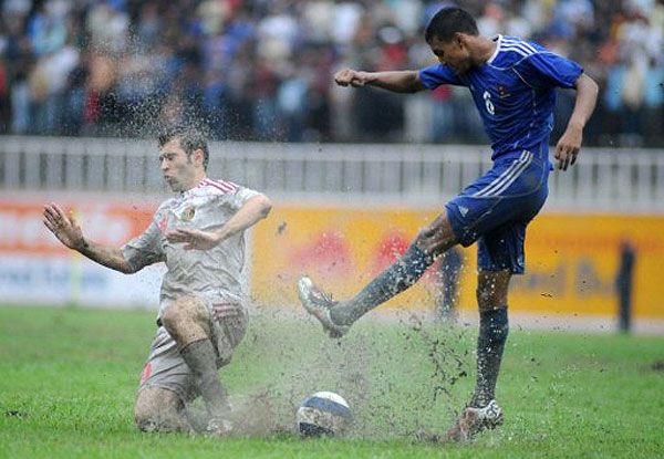 Непал, Катманду. Непальський захисник Рохіт Чанд та йорданський форвард Ахмад Хайель ведуть боротьбу за м'яч під час азіатського відбіркового матчу на Чемпіонат світу 2014. / © AFP