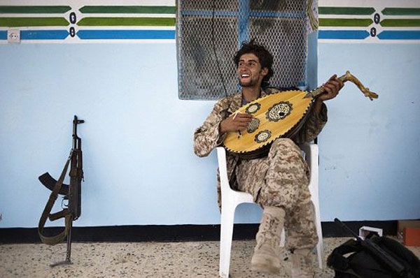 Лівійська Арабська Джамахірія, Газая. Лівійський повстанець грає на традиційному музичному інструменті "уд" після того, як бойовики-повстанці взяли під свій контроль селище Газая. / © AFP