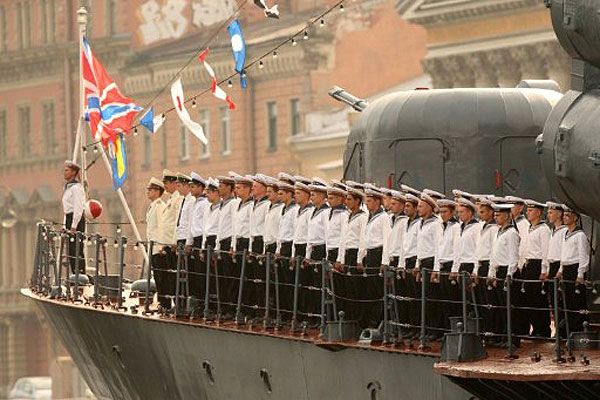 Росія, Санкт-Петербург. Російські моряки стоять на палубі корабля під час репетиції урочистого параду на честь святкування Дня ВМФ в Санкт-Петербурзі. День ВМФ в Росії відзначають в останню неділю липня. / © AFP