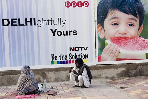 Індія, Нью-Делі. Безпритульна пара обідає на землі перед рекламним плакатом у Нью-Делі. В індійській столиці з 3 по 14 жовтня мають відбутися Ігри Співдружності, найбільша спортивна подія у місті з 1982 року. / © AFP