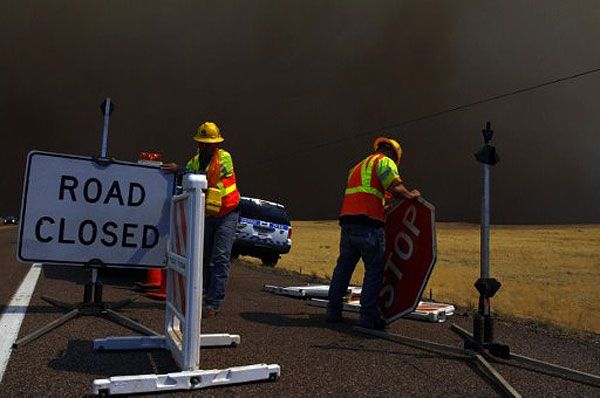 США, Спрінгервіль, штат Арізона. Робочі закривають рух на головній трасі міста Спрінгервіль, доки хмара диму від лісової пожежі піднімається над містом. Сотні тисяч гектарів землі постраждали через найбільші в історії Арізони лісові пожежі. / © AFP