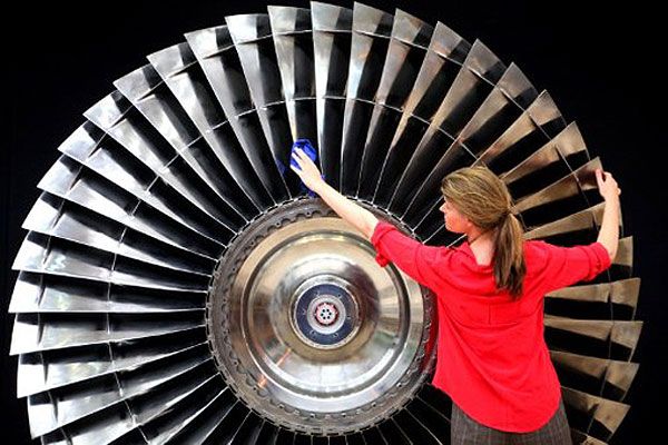 Великобританія, Лондон. Працівниця очищає реактивний двигун Pratt & Whitney, виготовлений у 1970 році, який виставили на ярмарку образотворчих мистецтв і антикваріату "Олімпія" в Лондоні. / © AFP