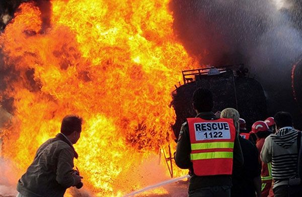 Пакистан, Пешавар. Пакистанські пожежні намагаються загасити палаючий нафтовий танкер НАТО після вибуху в Пешаварі. В результаті вибухів загинули троє співробітників служб безпеки, було знищено цистерни з нафтою. / © AFP