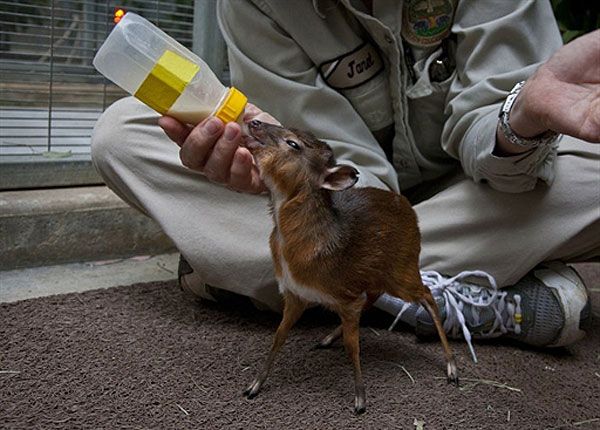 США, Сан-Дієго. Співробітник зоопарку годує з пляшечки дитинча королівської антилопи, яке важить усього 17 грамів. Антилопа народилася 20 січня у ветеринарній клініці зоопарку. Наразі королівську антилопу годують п'ять разів на добу. / © AFP