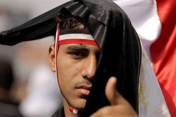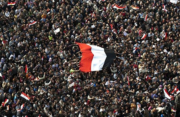 Єгипет, Каїр. Єгипетський учасник антиурядової демонстрації, вкритий національним прапором, бере участь у масовій акції протесту на площі Тахрір в центрі Каїра. В Єгипті триває 16-й день протестів проти 30-річного правління президента Хосні Мубарака. / © AFP