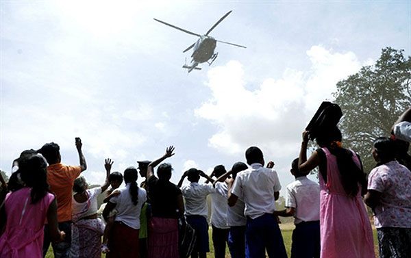 Шрі-Ланка. Жертви руйнівних повеней чекають на прибуття гелікоптера, на якому президент країни Махінда Раджапаксе відвідав район Полоннарува. ООН заявила, що шукає додаткові кошти для задоволення надзвичайних потреб жертв недавніх повеней, які були змушені залишити свої будинки. / © AFP