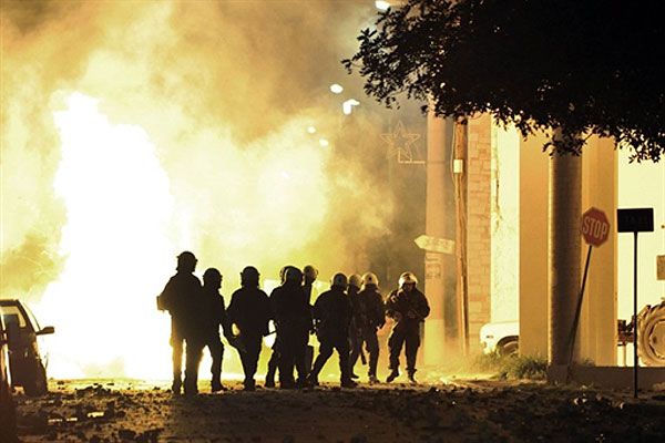 Греція, Кератеа. Фаєр вибухнув перед групою співробітників ОМОНу під час вуличних зіткнень у місті Кератеа поблизу Афін. Три людини були заарештовані, двоє поліцейських отримали поранення під час заворушень, які спалахнули між поліцією та місцевими жителями під час протестів проти будівництва нового звалища. / © AFP