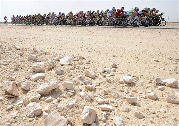 Катар, Доха. Велосипедисти змагаються під час другого етапу на 135,5 км гонки Camel Race Track. / © AFP