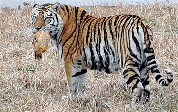 Китай, Шанхай. Тигр тримає в зубах курча у своєму вольєрі у парку дикої природи у Шанхаї. / © AFP