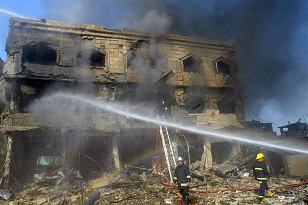 Ірак, Кіркуку. Пожежні гасять пожежу в будівлі, яка спалахнула після вибуху автомобіля у північному місті Кіркук. Три автомобілі вибухнули майже одночасно, в результаті вибуху загинули щонайменше вісім осіб. / © AFP