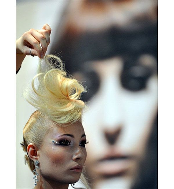 Україна, Київ. Стиліст робить зачіску моделі під час Кубка перукарів Києва під час IX Міжнародної виставки парфумерії і косметики Intercharm 2011. / © AFP