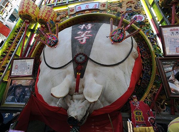 Тайвань, Тайбей. Величезна свиня висить на стіні даоського храму у Шансі під час святкування Фестивалю бога свиней у Тайбеї. Більше 60 свиней, яких спеціально відібрали для фестивалю, відгодовували, робили їм масаж протягом двох-трьох років. Щорічний конкурс свиней проводять на честь китайського місячного Нового Року. / © AFP