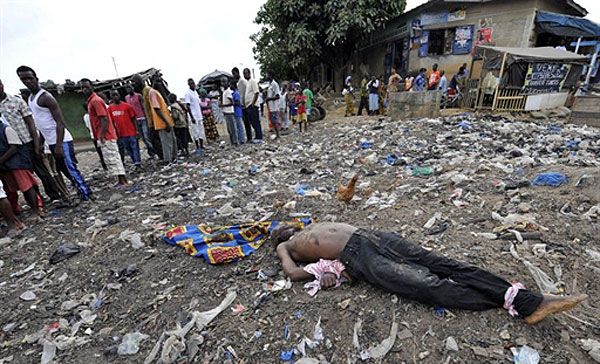 Кот-д'Івуар, Абіджан. Труп людини зі зв'язаними руками і ногами та перерізаним горлом лежить на землі у фортеці Кваттара у Абіджані. У Абіджані відбулись зіткнення між силами безпеки та прихильниками Алассана Уаттара, який був міжнародно визнаним переможцем на президентських виборах у листопаді 2010 року. / © AFP