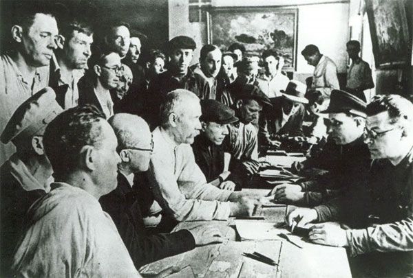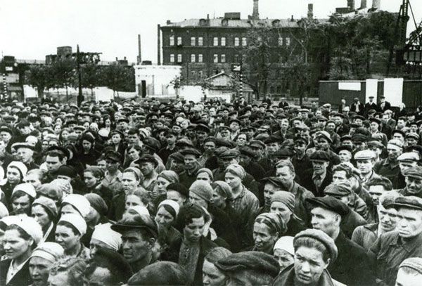 Працівники заводу "Серп і Молот" слухають повідомлення Радянського інформбюро про напад фашистської Німеччини на Радянський Союз, Москва, 21 червня 1941 року.