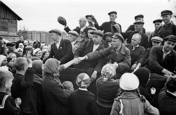Ополченці Московського інструментального заводу прямують до збірного пункту, Москва, червень 1941 року.
