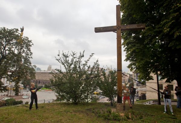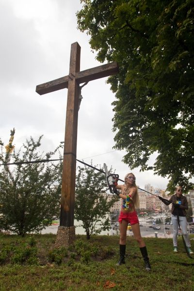 Активістки FEMEN бензопилою спиляли православний хрест в Києві