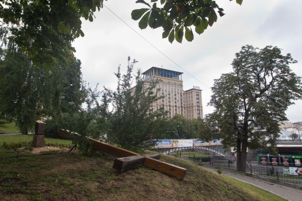 "На знак солідарності з жертвами кремлівсько-попівського режиму" дівчата спиляли бензопилою і звалили православний дерев'яний хрест, встановлений над Майданом Незалежності в пам'ять про жертв НКВС.