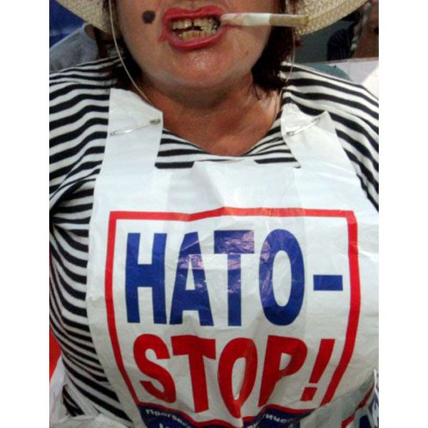 Прибічниця ПСПУ із написом ”НАТО-STOP!” на грудях та цигаркою в роті під час акції протесту проти проведення ”Сі Бриз – 2010” та проти вступу України до НАТО в Одесі / © УНІАН