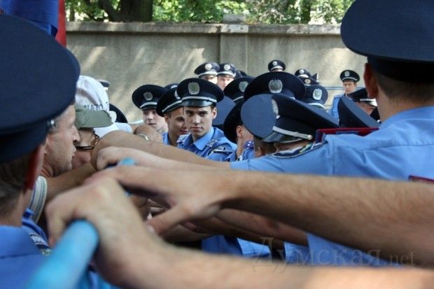 На чолі групи мітингувальників, які намагались прориватися до будівлі, знаходився депутат Одеської обласної ради від фракції ПСПУ Валерій Сергачов.