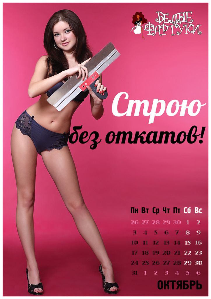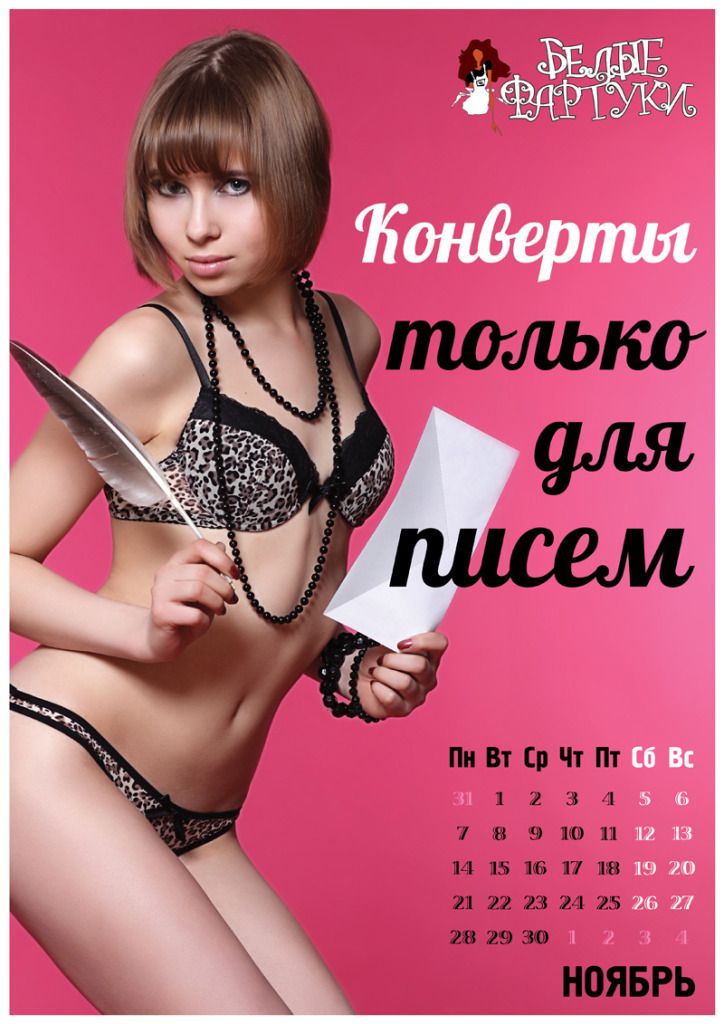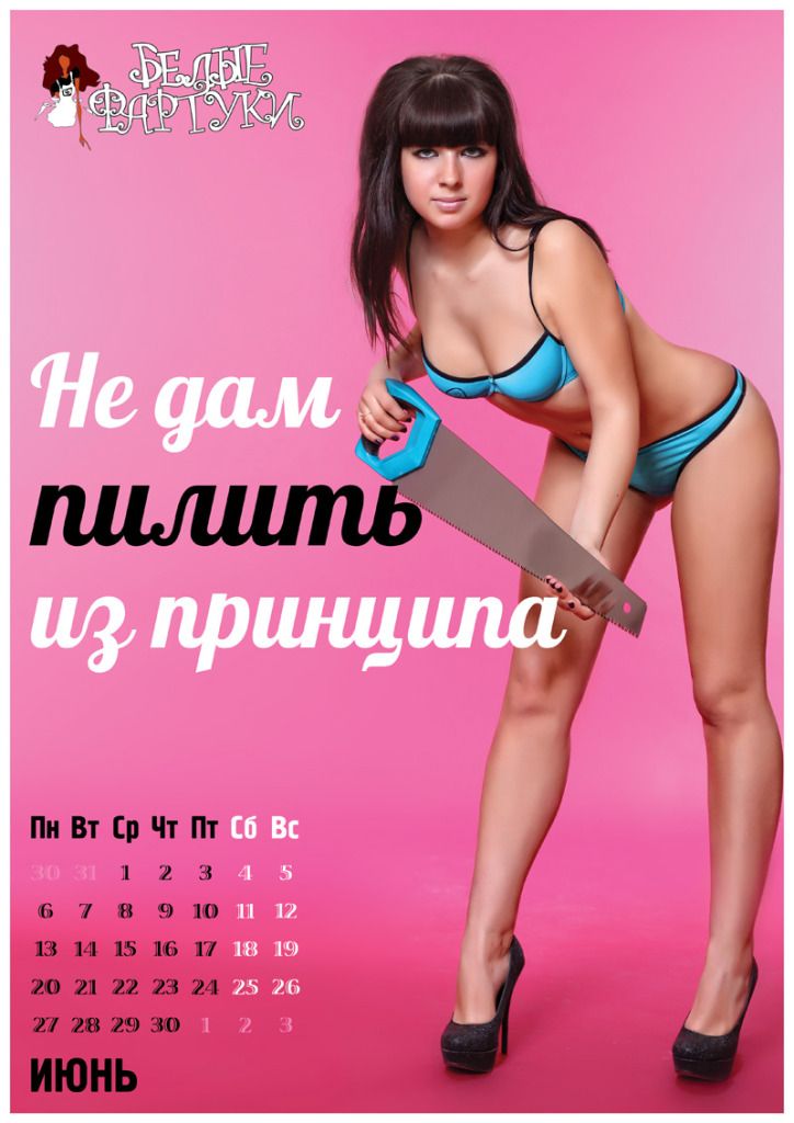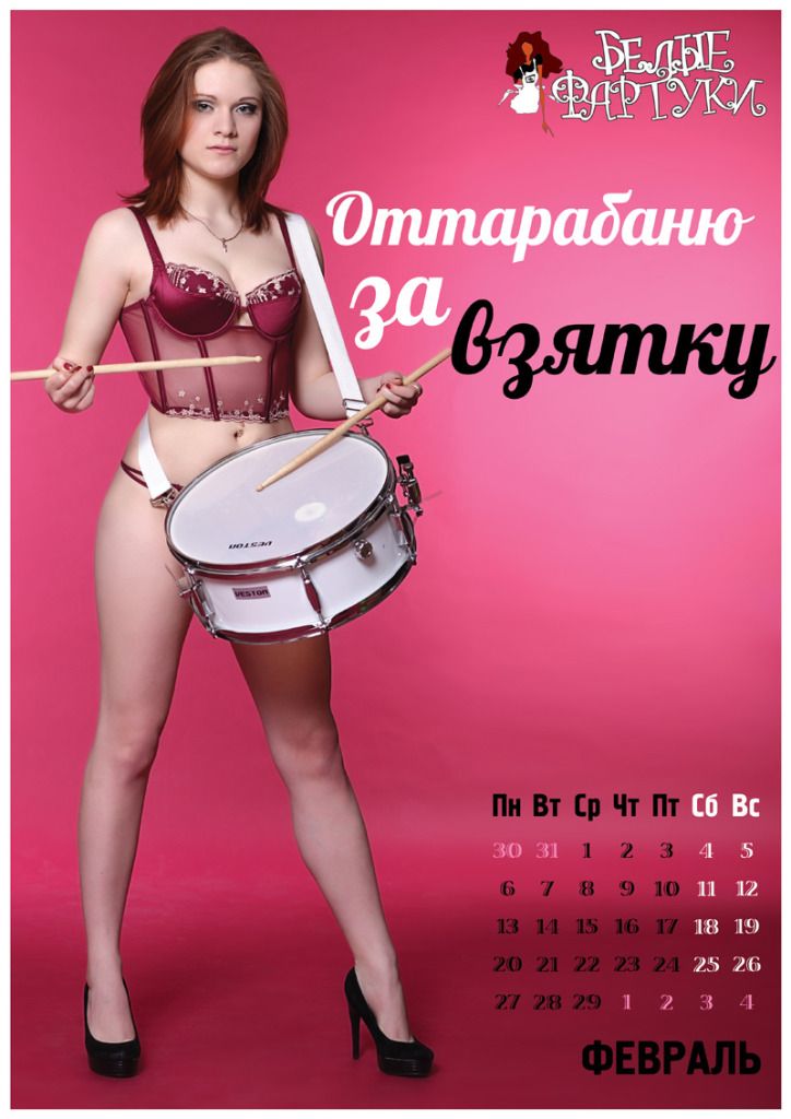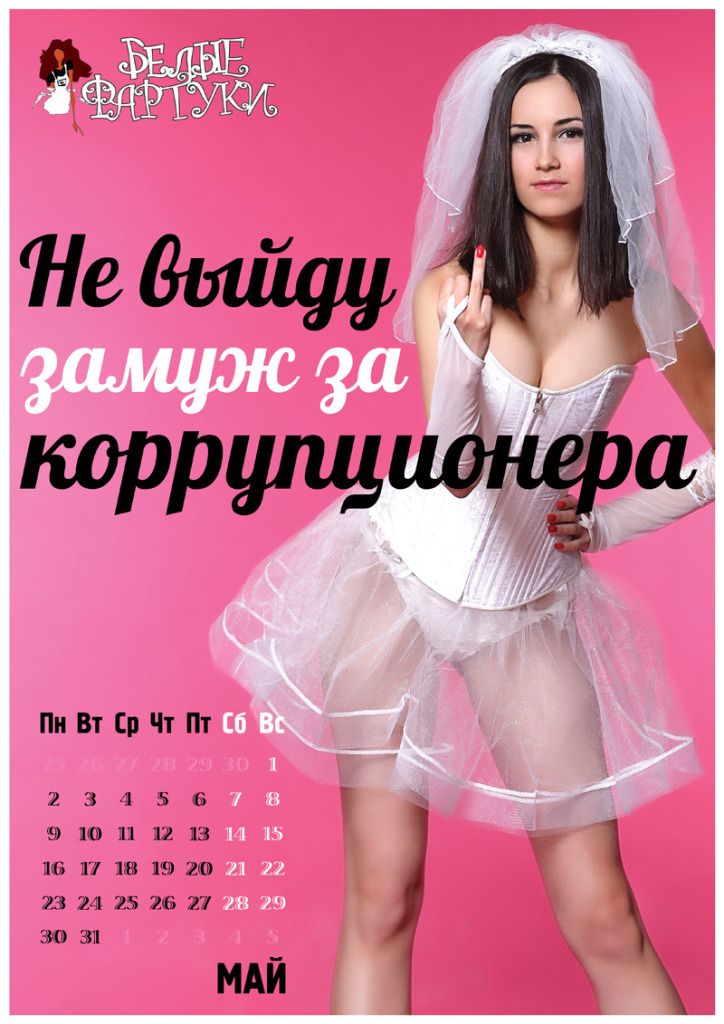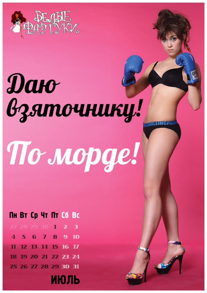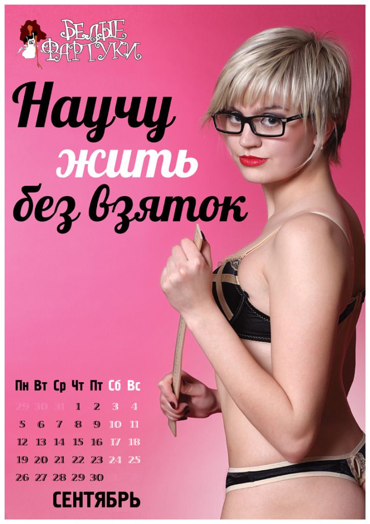 На сторінках антикорупційного календаря зображені учасниці акції "Білі фартухи" у нижній білизні і білосніжних фартухах. Фотографії супроводжуються підписами: "Не дам пиляти з принципу", "Вилікую від корупції".