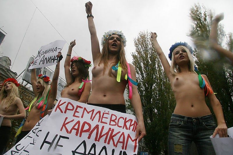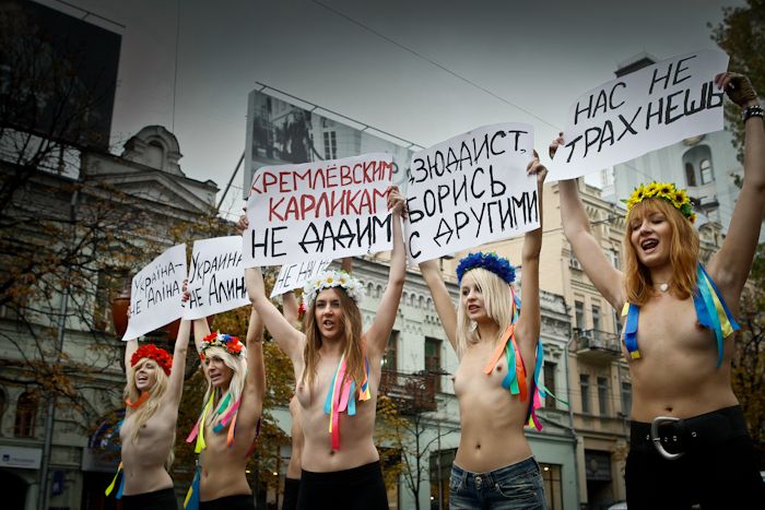 Дівчата принесли з собою плакати "Украина - не Алина", "Нас не нагнешь", "Путин, трогай любовницу, а не Украину", "Кремлевским карликам не дадим" / © femen.livejournal.com