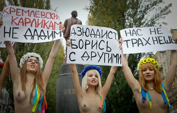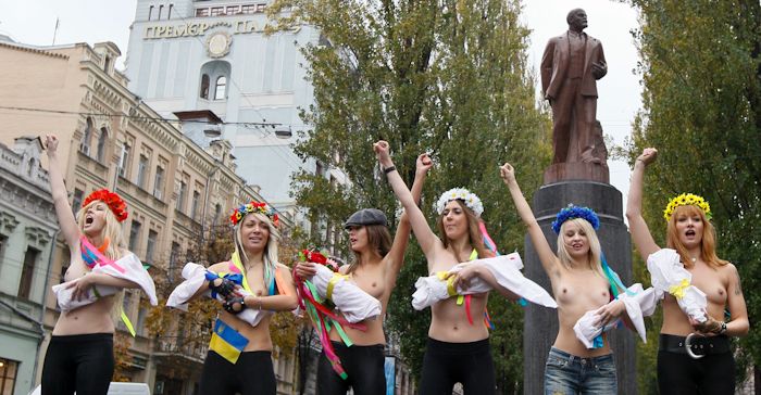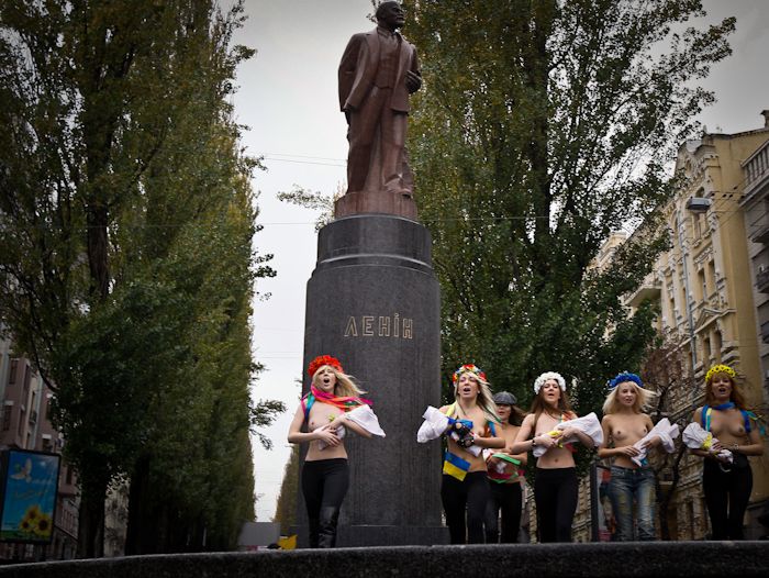 Активістки жіночого руху FEMEN влаштували біля пам’ятника Леніну в центрі Києва топлес-акцію "Україна - не Аліна" проти візиту до України прем'єр-міністра Росії Володимира Путіна. / © femen.livejournal.com