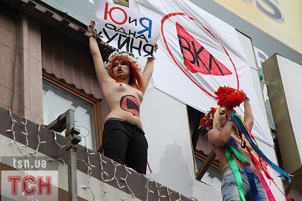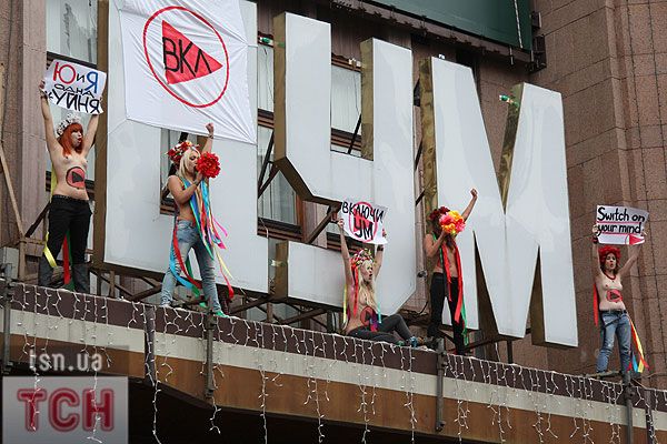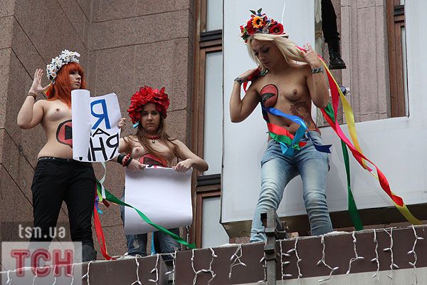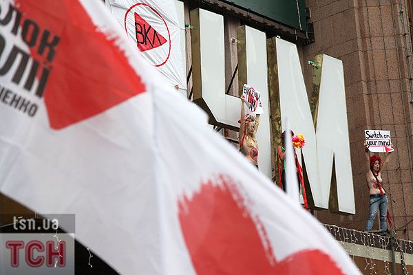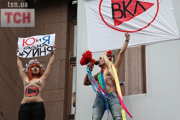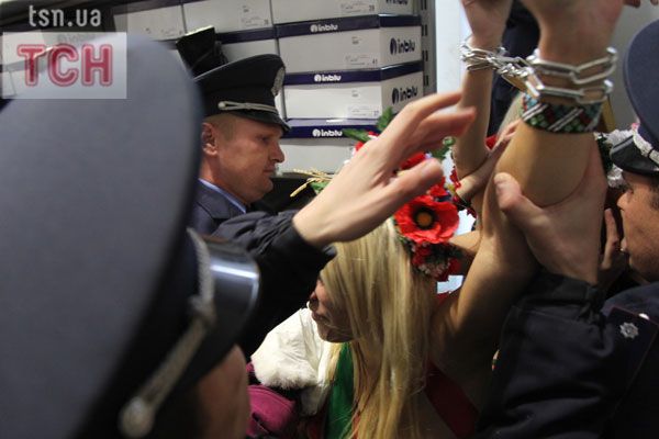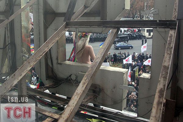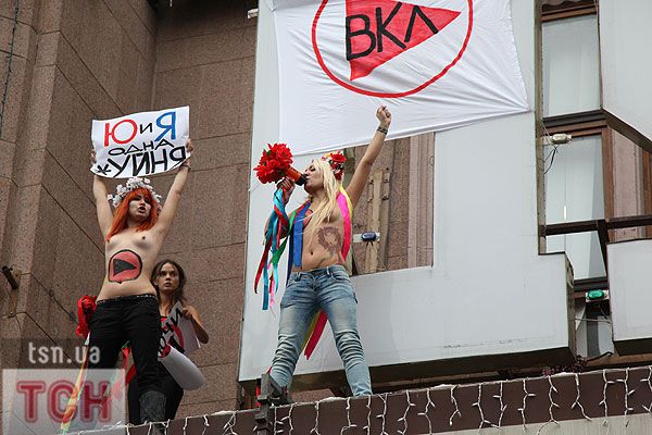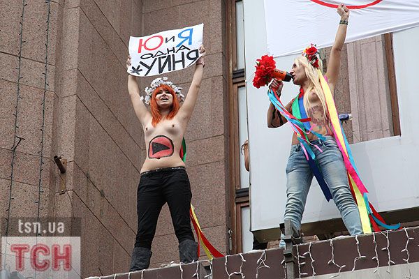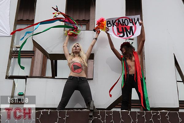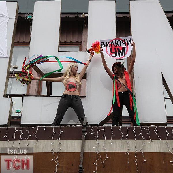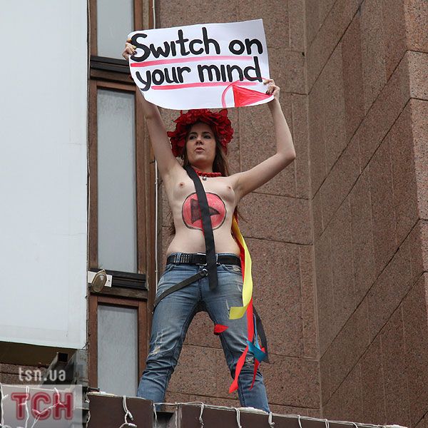 П'ятеро топлес-активісток видерлися на козирок із плакатом "Ю і Я - одна уйня", дівчата скандували "Включи розум" і розкидували згори листівки "Включи розум! Зрозумій головне: Тимошенко = Янукович". Активісток руху FEMEN затримала міліція та доставила у районне відділення.