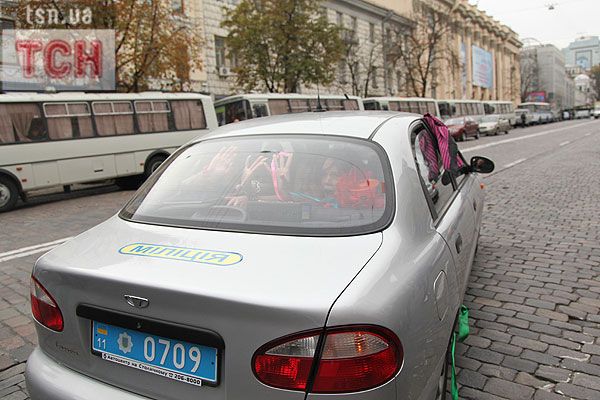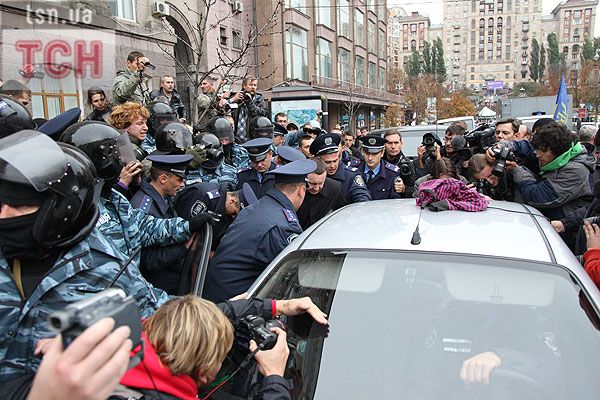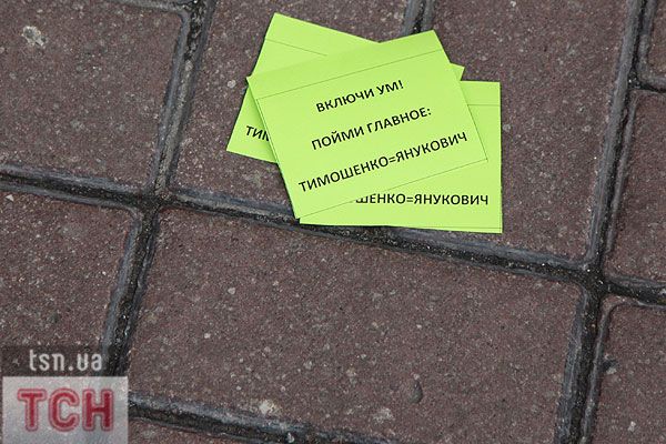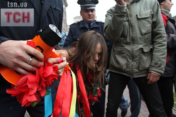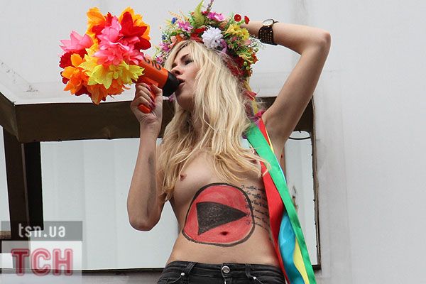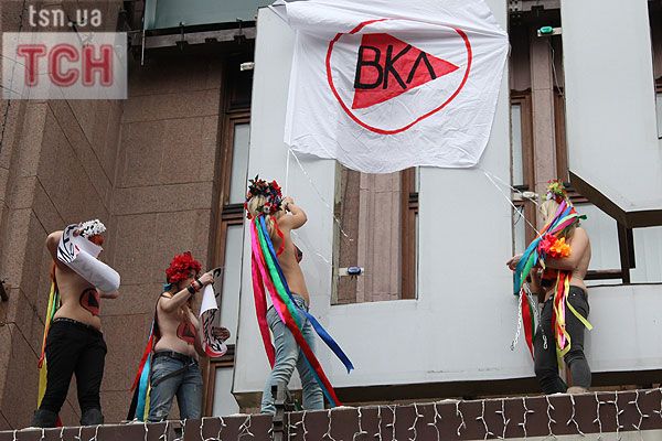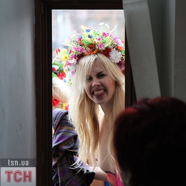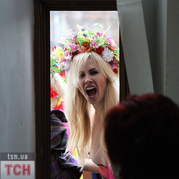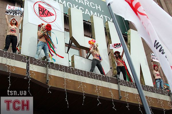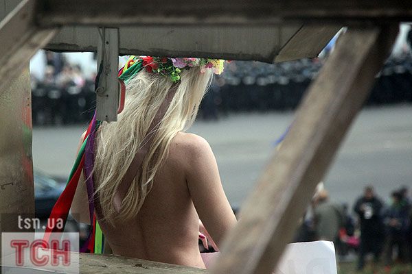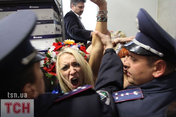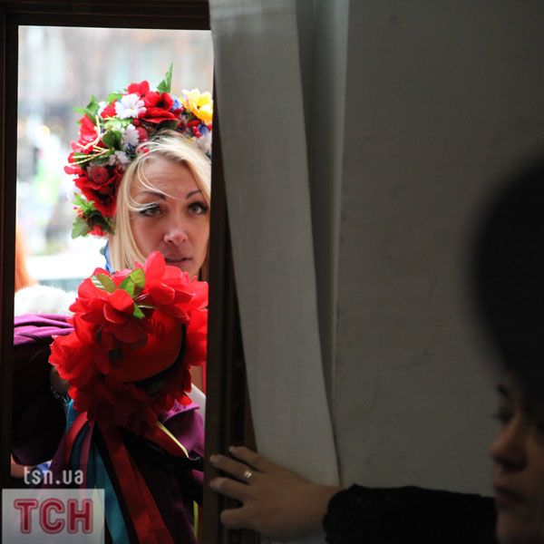 П'ятеро топлес-активісток видерлися на козирок із плакатом "Ю і Я - одна уйня", дівчата скандували "Включи розум" і розкидували згори листівки "Включи розум! Зрозумій головне: Тимошенко = Янукович". Активісток руху FEMEN затримала міліція та доставила у районне відділення.