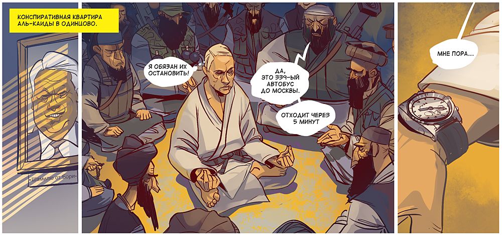 Перша серія коміксів про прем'єр-міністра Росії Володимира Путіна в ролі Людини-як-всі, та президента РФ Дмитра Мєдвєдєва, "нанолюдини", яка вміє перетворюватися на ведмедя. / © superputin.ru