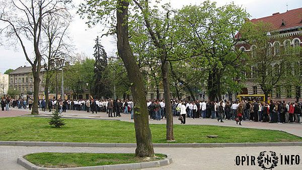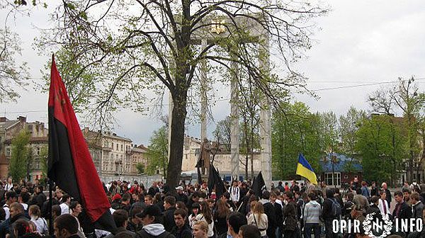 Близько двох тисяч молодих націоналістів 28 квітня пройшлись містом, в руках вони несли прапори, на щитах – золотих дивізійних левів – символіку воїнів "Галичини", а також величезний банер "Не для ката – наша хата" / © Opir.Info