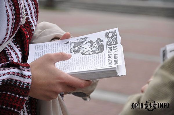 Лунали гасла "Наша земля – наші герої!", "Галичина – дивізія героїв!", "Хто ми – українці, що ми хочем – влади!", "Герої не вмирають – вмирають вороги!". Збоку колони ішли дівчата, роздаючи листівки. Перехожі приєднувались до процесії. / © Opir.Info