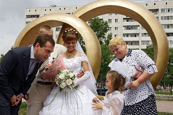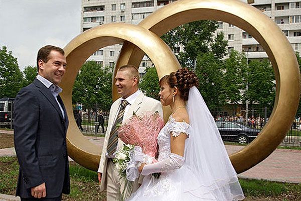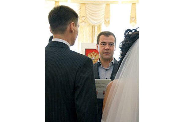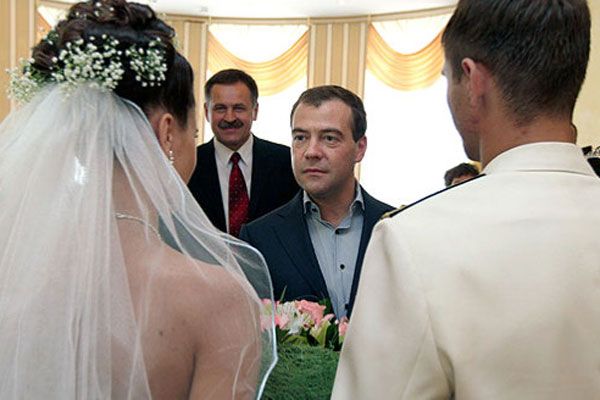 Президент Росії Дмитро Мєдвєдєв став свідком на трьох весіллях у ході свого візиту до Біробіджана. / © AFP