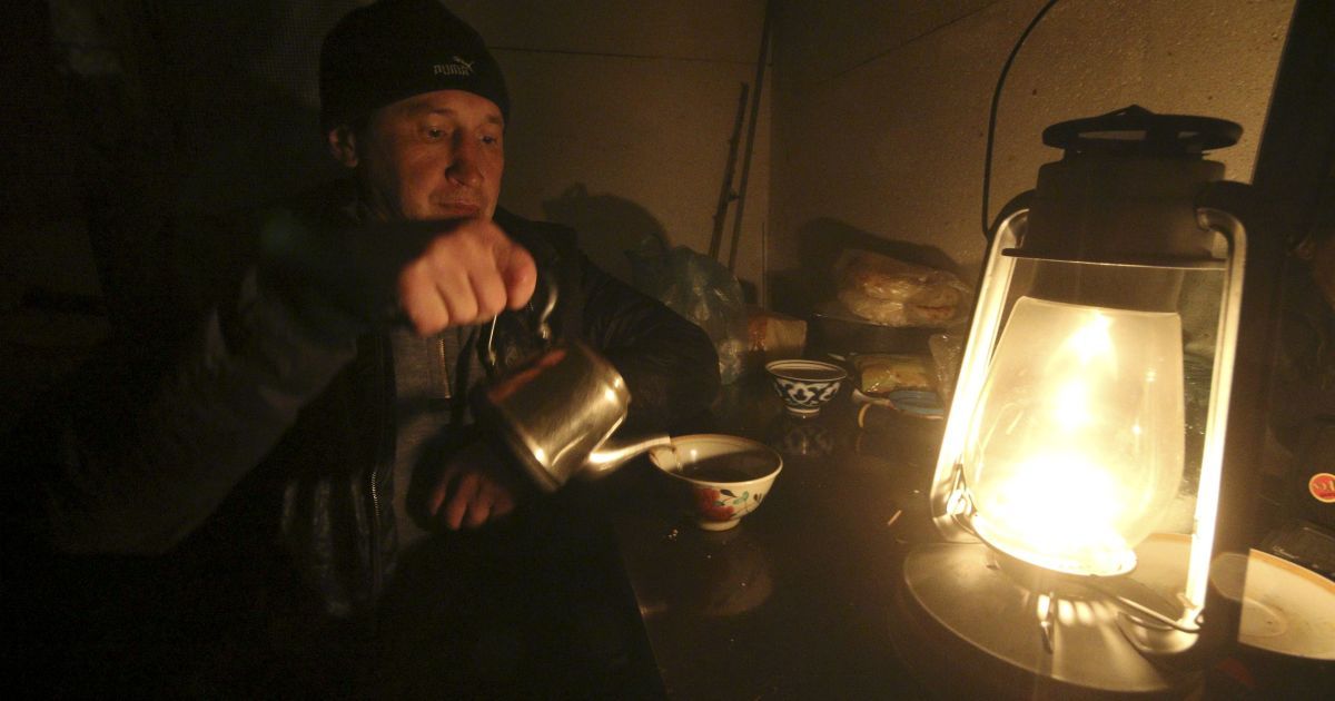 На фото зображений кримський татарин на імя Равшан, який їсть при світлі гасових ламп через вимкнення електроенергії в його будинку в селі Строгонівка Сімферопольського району Криму.