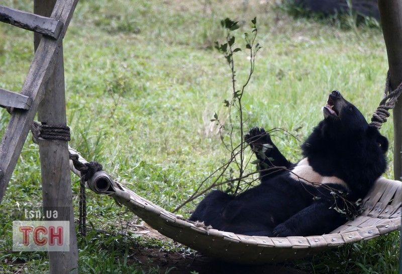 Активісти врятували ведмедя від загибелі, який тепер облюбував собі гамак / © Фото EPA/UPG